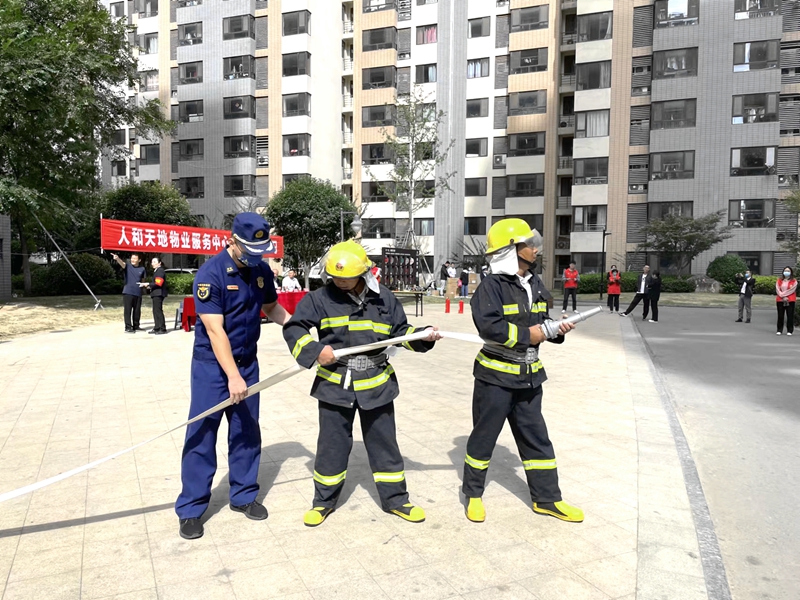 活動當天,人和天地物業服務中心組織工作人員開展了火情處置消防演練,并邀請到市消防大隊、財貿醫院工作人員講解滅火器、消防栓、消防水帶等器材的使用方法和傷員急救知識。